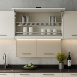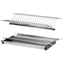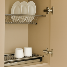 Ein hochwertiges Abtropfgestell für Geschirr aus Edelstahl ist für die Montage in oberen Küchenschränken vorgesehen, wo es ein effizientes Trocknen des Geschirrs gewährleistet und gleichzeitig Ordnung in Ihrer Küche hält.