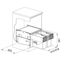 Das System ist für Unterschränke mit einer Breite von 45 cm bestimmt und ermöglicht eine bequeme Mülltrennung in separaten Behältern mit praktischen Griffen.