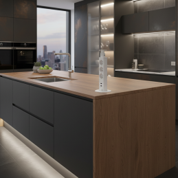 Die moderne versenkbare Steckdose in elegantem Weiß ist eine praktische Lösung für Küchen, Büros oder Schreibtische. Nach dem Drücken verschwindet sie in der Arbeitsplatte, spart so Platz und wirkt ästhetisch sauber. Mit einem Knopfdruck fährt sie heraus und ist sofort einsatzbereit.