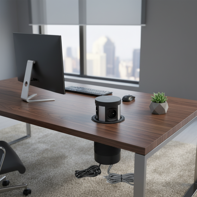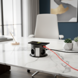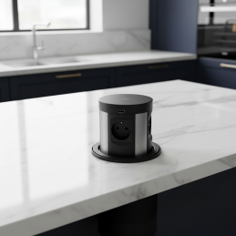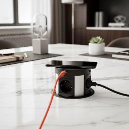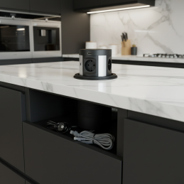 Exklusive ausziehbare Steckdosenleiste, geeignet für Küche, Büro oder Konferenzräume. Bietet vollständige Konnektivität – 4× 230-V-Steckdosen rundum, 2× USB-Ports zum Laden und 2× RJ45 Netzwerkports für den Anschluss an das Computernetzwerk. Das elegante Design ermöglicht es, das Gerät direkt in der Arbeitsplatte zu verstecken und nur bei Bedarf zu verwenden.
