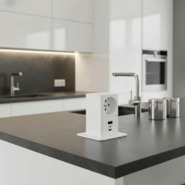 Elegante und praktische ausziehbare Steckdose in modernem mattem Weiß. Sie ist mit einem französischen Stecker (Typ E) ausgestattet, der mit dem slowakischen, tschechischen, französischen und polnischen Markt kompatibel ist. Ideale Lösung für Küchen, Schreibtische und Büros – überall dort, wo Sie eine Steckdose griffbereit haben möchten, aber das saubere Erscheinungsbild der Arbeitsfläche nicht stören wollen.
