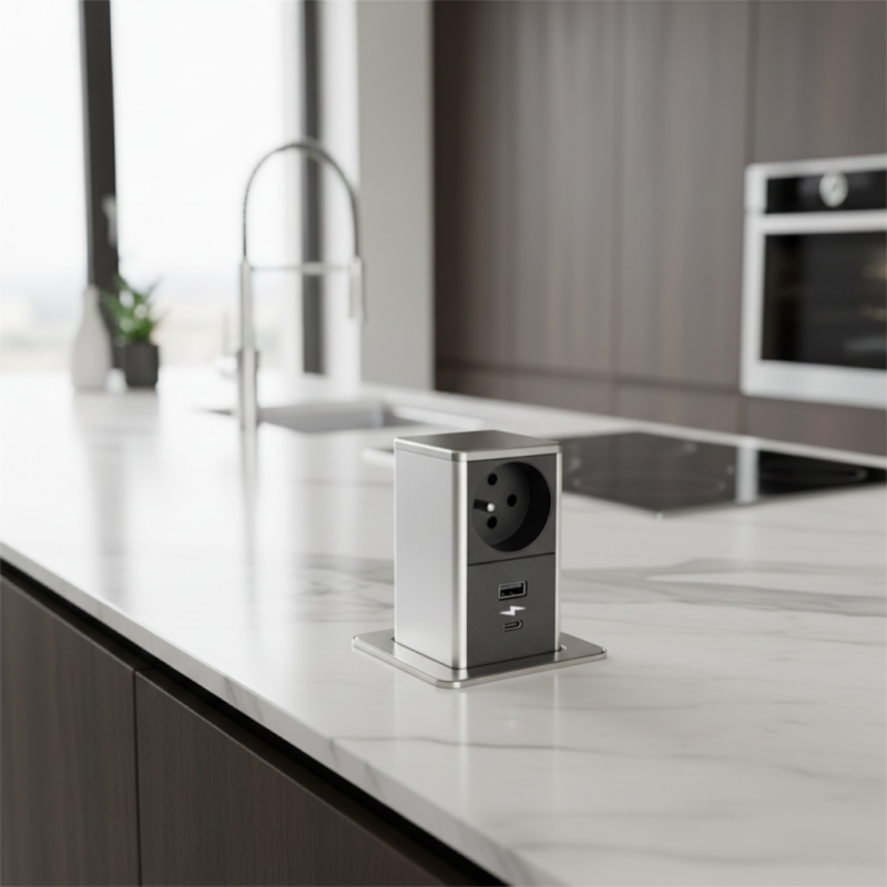 Moderne versenkbare Steckdose in elegantem Edelstahl-Design, ideal für Küchen, Schreibtische oder Arbeitsflächen. Dank des minimalistischen Designs und der Edelstahloberfläche wirkt sie luxuriös und zeitlos. Die Steckdose hat einen französischen Anschluss (Typ E) – geeignet für Slowakei, Tschechien, Frankreich und Polen.