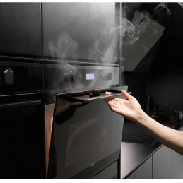 Elegantes schwarzes Glas und ein Innenraum aus Edelstahl verleihen dem Gerät ein zeitloses Aussehen, das perfekt in eine moderne Küche passt.
