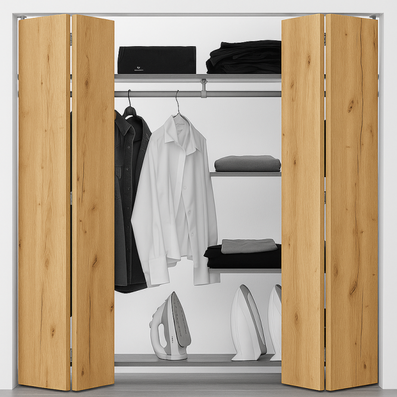 Das EKOFOLD-System ist so konzipiert, dass es den Raum mit einer Falttür abschließt, die sich beim Öffnen einfach zur Seite faltet. Das spart Platz und eignet sich besonders für Garderoben, Schränke, Hauswirtschaftsräume oder kleinere Räume.