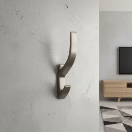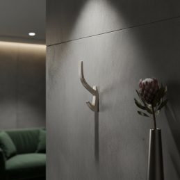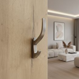 Der elegante und moderne KOS-Kleiderhaken in gebürsteter Nickel-Ausführung wirkt zeitlos und fügt sich perfekt sowohl in minimalistische als auch in Premium-Innenräume ein. Die dezent matte Metalloberfläche ist unempfindlich gegen Fingerabdrücke und hebt die Form des Doppelhakens hervor, der eine praktische Ablage für Kleidung, Handtücher oder Accessoires bietet.
