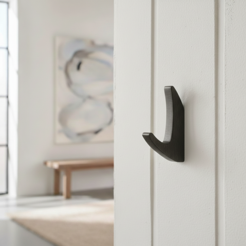 Moderner und eleganter Haken KOS Mini in der Ausführung schwarz gebürstet ist das ideale Accessoire für minimalistische, industrielle und luxuriöse Innenräume. Die fein gebürstete Oberfläche verleiht dem Haken ein hochwertiges mattes Aussehen und eine angenehme Textur. Die kompakte Größe sorgt dafür, dass er dezent wirkt, aber dennoch volle Funktionalität beim Aufhängen von Kleidung oder Accessoires bietet.