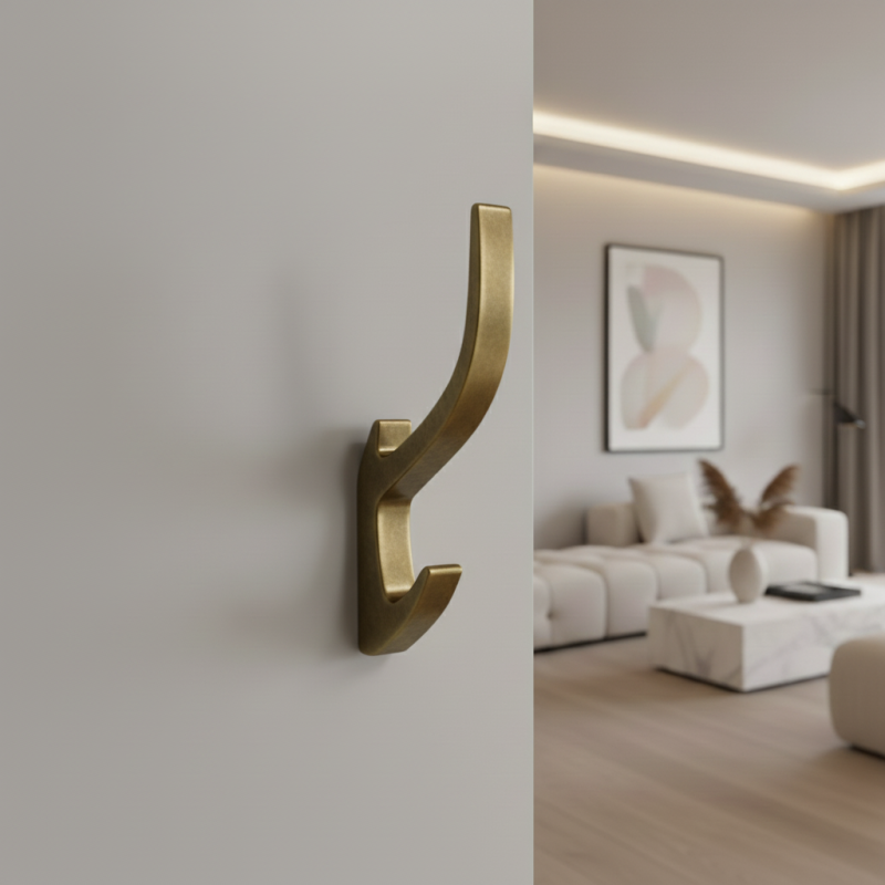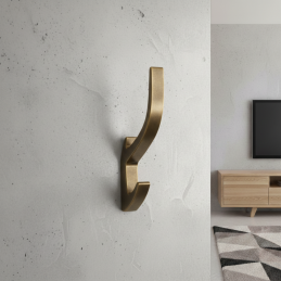 Der stilvolle und elegante KOS-Kleiderhaken in antik-goldener Ausführung verleiht dem Interieur einen Hauch von Luxus und klassischer Eleganz. Die sanft abgerundete Form und der doppelte Haken ermöglichen das praktische Ablegen von Kleidung, Handtüchern oder Accessoires. Die Oberfläche „Antik-Gold” sorgt für ein raffiniertes, leicht patiniertes Aussehen, das sowohl für traditionelle als auch moderne Räume geeignet ist.