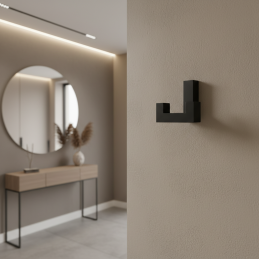 Eleganter und praktischer Kleiderbügel in modernem Design mit Frontmontage auf einer Unterlage. Die Montage ist einfach - die Unterlegscheibe wird mit Dübeln und Schrauben (im Lieferumfang enthalten) an der Wand befestigt, dann wird der Aufhänger darauf montiert und mit einer Schraube von unten fixiert.