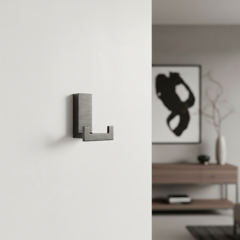 Eleganter und kompakter Design-Kleiderhaken in gebürstetem Schwarz, der sich perfekt in moderne sowie industrielle Innenräume einfügt. Dank der kleineren Abmessungen ist er ideal für Flure, Badezimmer, Garderoben oder Möbel, bei denen ein sauberer und unauffälliger Look gewahrt werden soll.