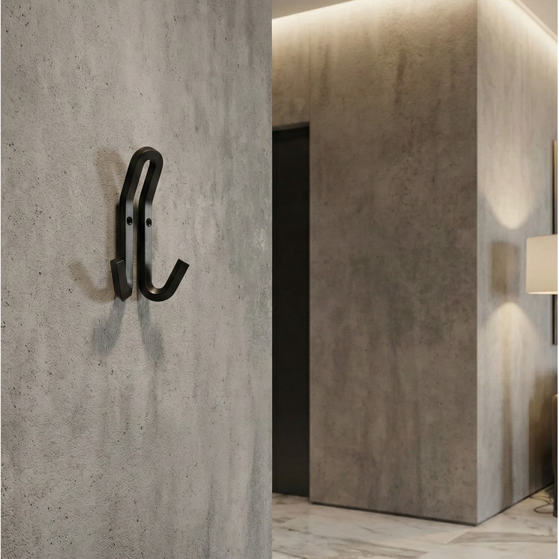 Der Haken wird von vorne mit Schrauben montiert, die im Lieferumfang enthalten und farblich auf den Haken abgestimmt sind. Die schwarze, matte Oberfläche wirkt elegant und lässt sich leicht mit modernen sowie industriellen Interieurs kombinieren.