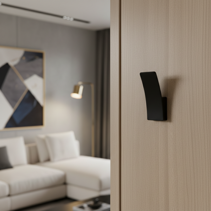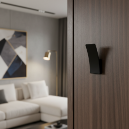 Moderner Designer-Kleiderhaken, der gleichzeitig auch als Möbelgriff – Knopf dienen kann. Dank der kompakten Maße und der sanft geschwungenen Form ist er ideal für minimalistische und moderne Innenräume. Geeignet für Schränke, Schubladen, Garderoben sowie Wände in Wohn- oder Geschäftsräumen.