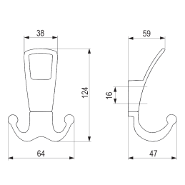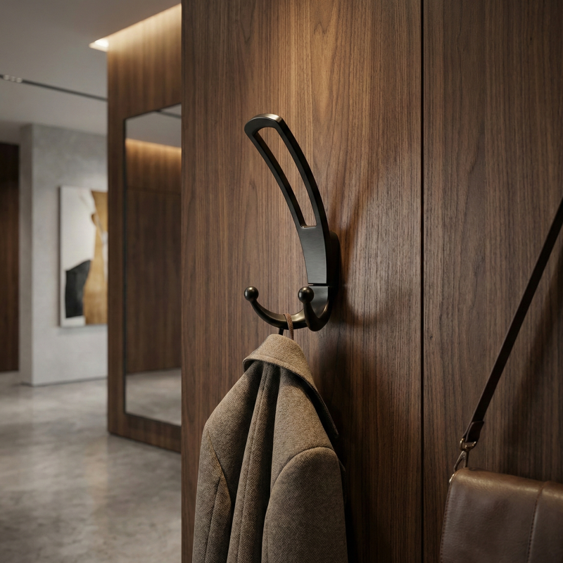 Der Haken ist für die Frontmontage an Wand oder Möbel vorgesehen, wobei die Befestigungsschrauben sichtbar und leicht zugänglich sind. Dank der robusten Metallverarbeitung bietet er hohe Festigkeit und Zuverlässigkeit, auch beim Aufhängen schwererer Mäntel, Jacken oder Taschen.