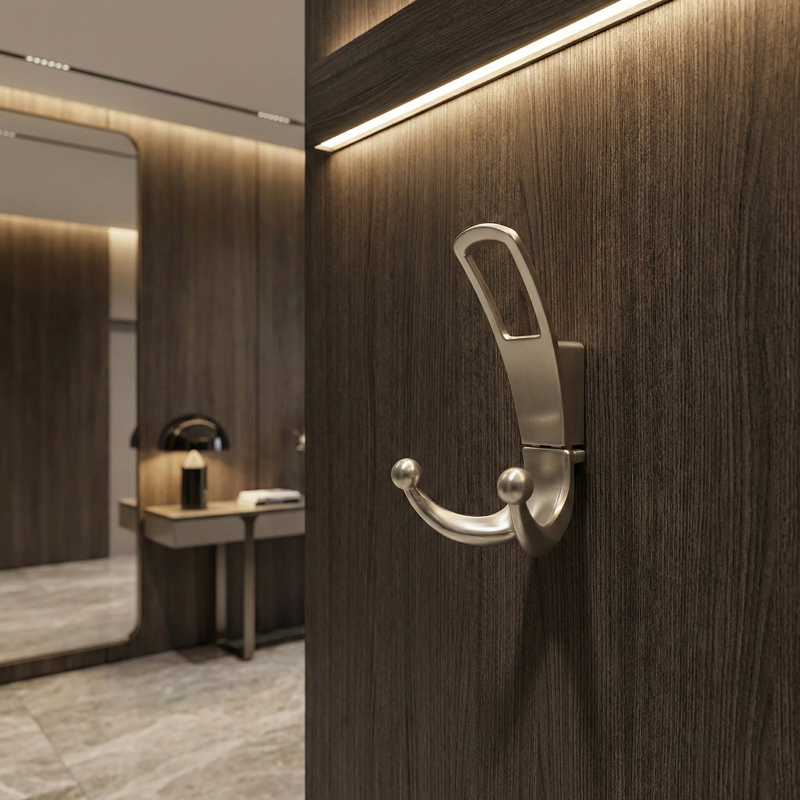 Der Kleiderhaken hat eine einteilige Konstruktion mit unterem Doppelhaken, die ausreichend Platz zum Aufhängen von Mänteln, Jacken, Taschen oder Accessoires bietet. Er ist für die Frontmontage an Wand oder Möbel vorgesehen, mit sichtbaren Befestigungspunkten für eine einfache und schnelle Installation.
