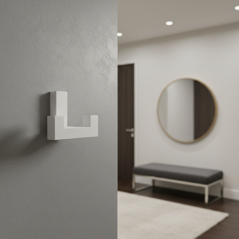 Eleganter und praktischer Kleiderbügel in modernem Design mit Frontmontage auf einer Unterlage. Die Montage ist einfach - die Unterlegscheibe wird mit Dübeln und Schrauben (im Lieferumfang enthalten) an der Wand befestigt, dann wird der Aufhänger darauf montiert und mit einer Schraube von unten fixiert.