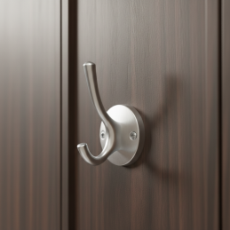 Der Haken ist mit einem Doppelhaken ausgestattet, der ausreichend Platz zum Aufhängen von Mänteln, Jacken, Handtaschen oder Accessoires bietet. Er ist für die Frontmontage an Wand oder Möbeln vorgesehen, wobei die Befestigungsschrauben sichtbar und dezent in das Design der Rosette integriert sind.
