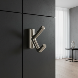 Eleganter Design-Kleiderhaken VIDOX in der Ausführung Edelstahl ist ein modernes und funktionales Accessoire für zeitgemäße Innenräume. Seine charakteristische Form mit dem Doppelarm erhöht die Praktikabilität und wirkt gleichzeitig als markantes Designdetail.