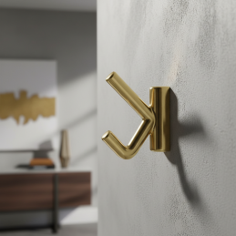 Der Kleiderhaken ist aus hochwertigem Metall mit gebürsteter Goldoberfläche gefertigt, die dem Raum ein luxuriöses und anspruchsvolles Aussehen verleiht. Die Montage erfolgt von vorne auf die Unterlage, was eine feste, stabile und ästhetisch saubere Befestigung gewährleistet.