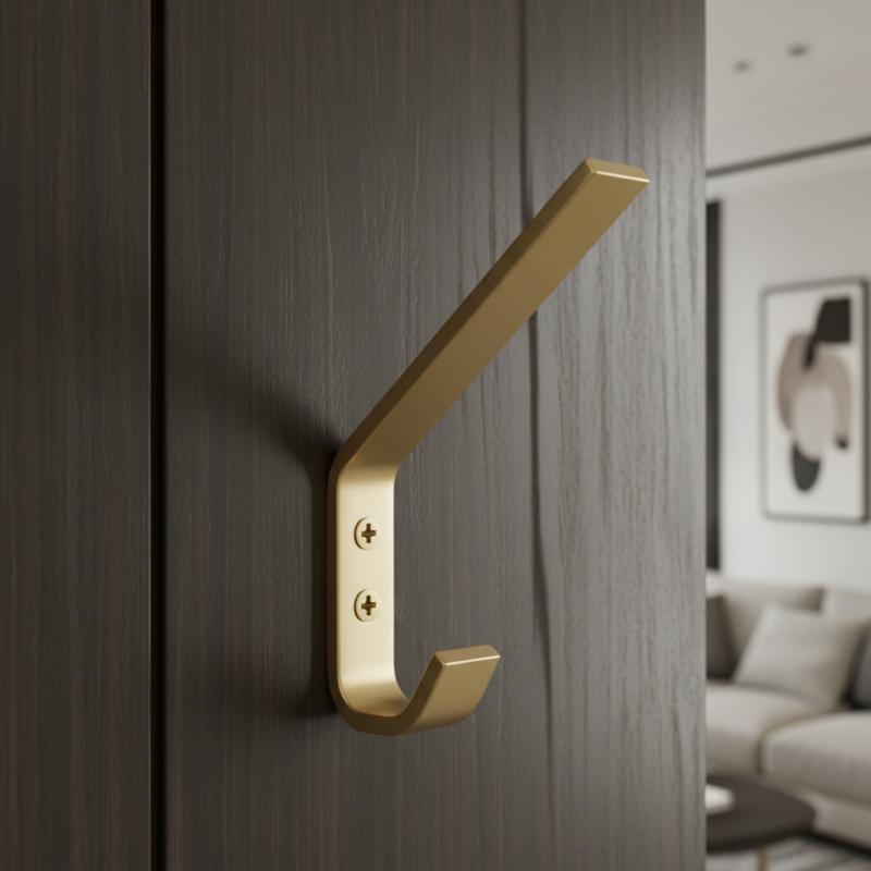 Luxuriöser und moderner Kleiderhaken VILACH in der Ausführung gebürstetes Gold verleiht jedem Interieur einen eleganten und anspruchsvollen Touch. Die gebürstete Goldausführung wirkt besonders stilvoll und ist ideal für moderne, glamouröse sowie minimalistische Räume, in denen ein markantes, aber dennoch klares Designelement gefragt ist.