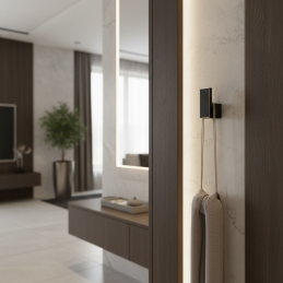 Der Haken DESIGNO in schwarzer matter Ausführung ist die ideale Wahl für Kunden, die ein klares Design, eine diskrete Lösung und hohe Funktionalität in einem modernen Interieur suchen.