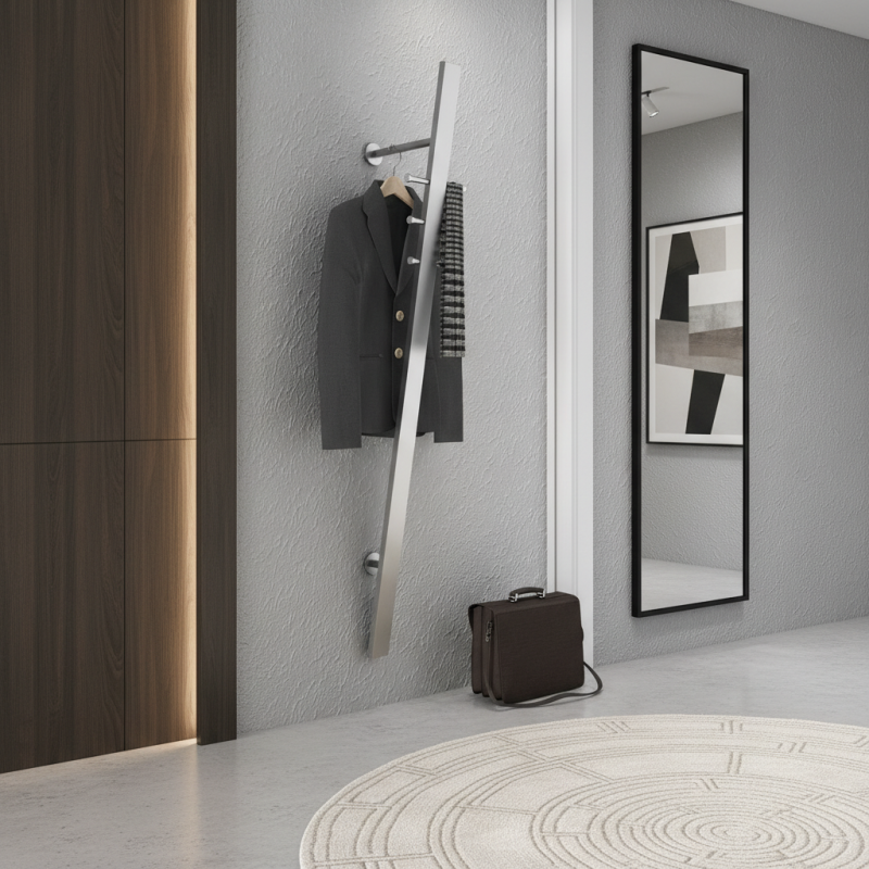 Design-Garderobenhaken CARLOS in zeitloser Ausführung Edelstahl ist ein markantes und funktionales Element moderner Innenräume. Seine originelle schräge Form in Kombination mit mehreren Metallhaken schafft einen eleganten visuellen Akzent und bietet gleichzeitig praktischen Platz zum Aufhängen von Kleidung, Mänteln, Schals oder Taschen.