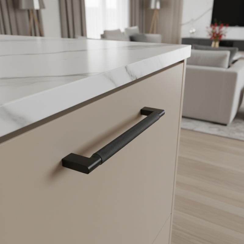 Design-Griff INDUST in der Oberflächenbehandlung schwarz matt ist ein markantes Element des industriellen Stils, das den Möbeln ein luxuriöses und modernes technisches Aussehen verleiht. Die gerändelte Oberfläche bietet nicht nur einen hochwertigen ästhetischen Eindruck, sondern auch einen hervorragenden Griff. Die massive Metallkonstruktion sorgt für eine lange Lebensdauer und Widerstandsfähigkeit bei täglichem Gebrauch.