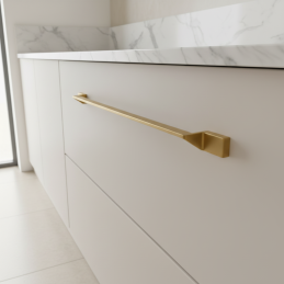 Der Griff VENITA in luxuriöser Ausführung mattes Gold stellt ein modernes Designelement mit einer markanten, aber sehr dezenten Ästhetik dar. Die charakteristische seitliche Abkantung verleiht ihm ein originelles Aussehen und sorgt gleichzeitig für einen bequemen Griff. Dank des minimalistischen und schlanken Profils ist er ideal für moderne, zeitlose und auch Premium-Möbelsets.
