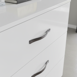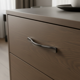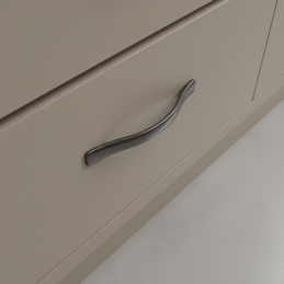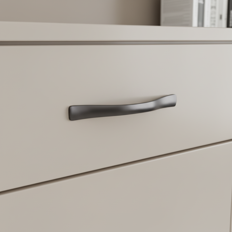Der Griff NICOLA in anthrazitmatter Ausführung bietet ein modernes, elegantes und markantes Design, das sich perfekt in zeitgemäße Innenräume einfügt. Seine sanft geschwungene Form sorgt für eine ergonomische und angenehme Handhabung, während die dunkle, matte Oberfläche dem Möbelstück ein luxuriöses und raffiniertes Aussehen verleiht.