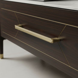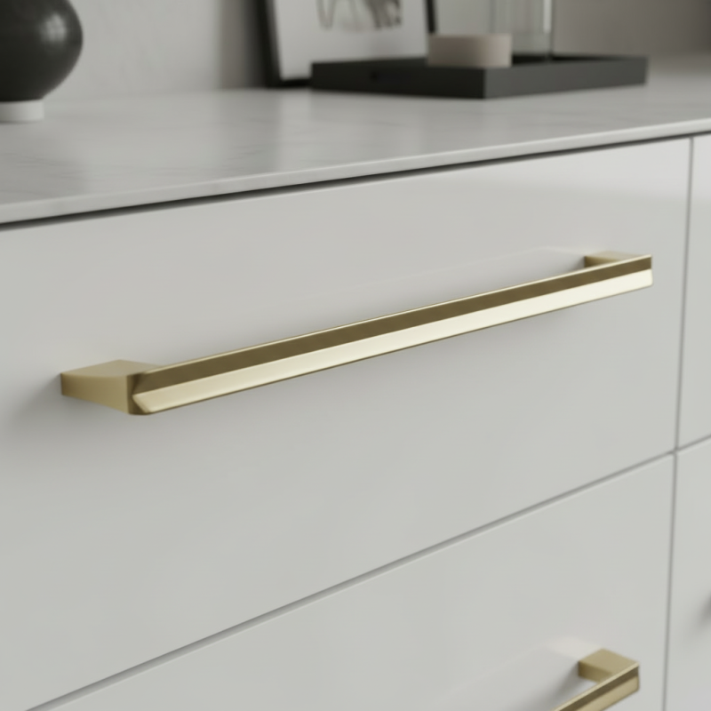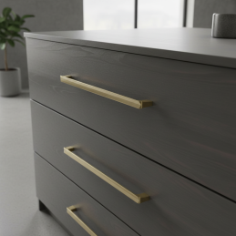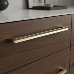 Der Griff VELOS in der Ausführung Gold matt bringt modernen Minimalismus in Kombination mit einem Hauch von Luxus ins Interieur. Seine verlängerte, schlanke Form wirkt elegant und zeitlos, während die matte goldene Oberfläche dem Möbelstück ein exklusives, aber dennoch sehr geschmackvolles Aussehen verleiht. Die perfekte Wahl für moderne Küchen, Design-Kommoden, Kleiderschränke oder Einbauschränke.