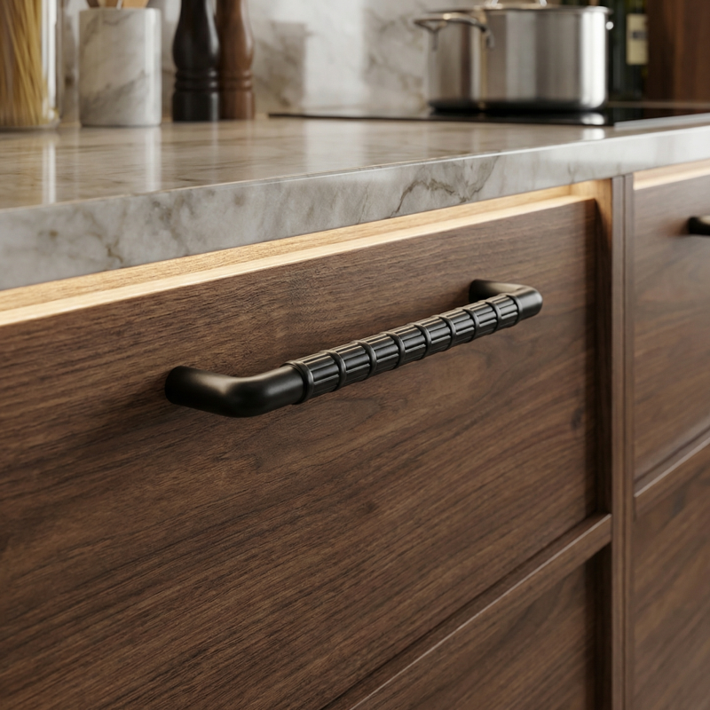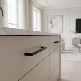 Der TAU-Griff in schwarzer, matter Ausführung ist die ideale Wahl für Kunden, die ein hochwertiges, durchdachtes und zeitloses Detail für moderne Möbel suchen.