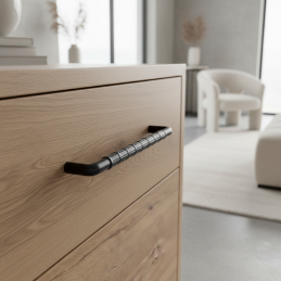 Der schöne Design-Griff TAU in der Ausführung schwarz matt ist ein markantes Detail, das Möbeln einen modernen bis industriellen Charakter verleiht. Der präzise gearbeitete, gerändelte Griff sieht nicht nur gut aus, sondern sorgt auch für einen bequemen und sicheren Halt.