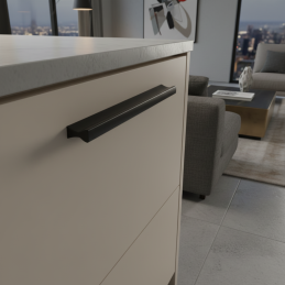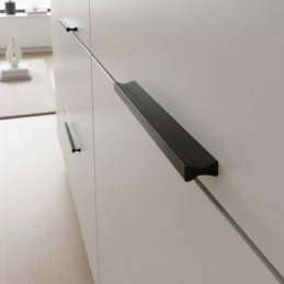 Der Griff PIREA in der Ausführung schwarz matt repräsentiert ein modernes, minimalistisches Design mit luxuriösem Charakter. Das schlanke Profil und die feine Formgebung verleihen den Möbeln ein elegantes und zeitloses Aussehen. Die matte schwarze Oberfläche wirkt stilvoll und passt perfekt zu modernen Interieurs, besonders zu dunklen oder kontrastierenden hellen Flächen.