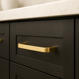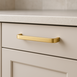 Der Design-Griff SAMBA in glänzender Goldausführung ist die ideale Lösung für alle, die ein modernes, minimalistisches und zeitloses Accessoire für ihre Küche, ihr Bad oder ihr Wohnzimmer suchen. Dank seiner feinen Form und präzisen Verarbeitung ergänzt er perfekt jede Art von Möbelstück.