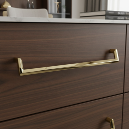Der Griff AMORA in glänzender Goldausführung ist ein markantes und elegantes Designelement, das jedem Möbelstück einen luxuriösen und modernen Charakter verleiht. Seine klaren geometrischen Linien mit sanfter Abwinkelung wirken zeitlos, und dank des hohen Glanzes wird der Griff zum attraktiven Blickfang an Küchenschranktüren, Kommoden, Kleiderschränken oder Badmöbeln.
