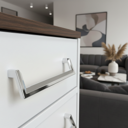 Der Griff AMORA in glänzendem Chrom ist eine ausgezeichnete Wahl für alle, die ein elegantes, modernes und universelles Accessoire mit sauberem und repräsentativem Aussehen suchen, das für jeden Einrichtungsstil geeignet ist.