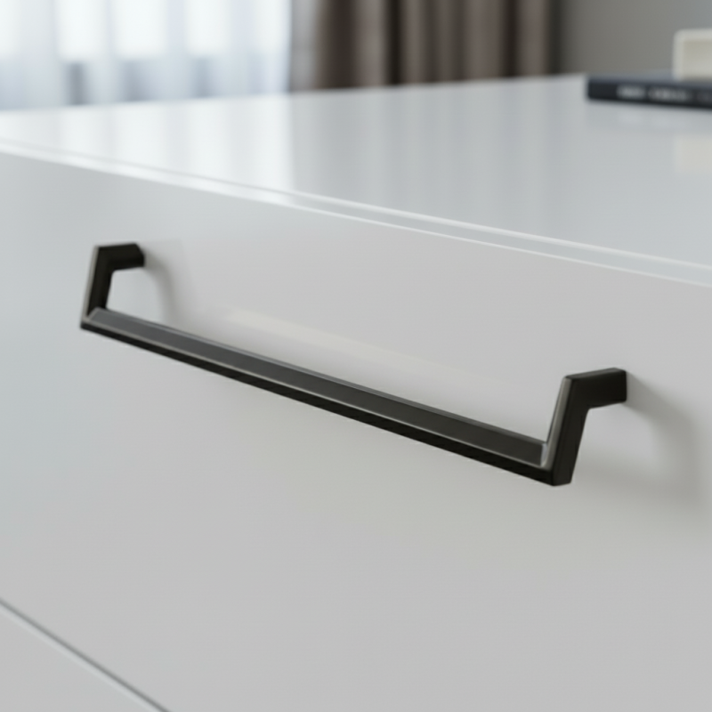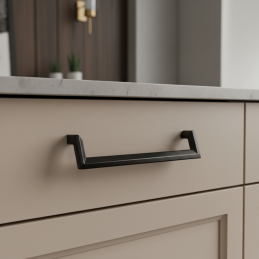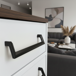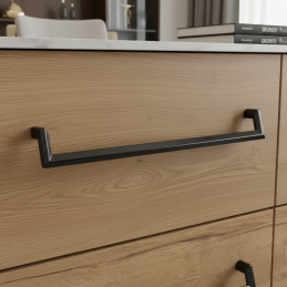 Der Griff AMORA in schwarzer, matter Ausführung ist ein modernes, markantes und äußerst elegantes Accessoire, das Ihren Möbeln einen stilvollen, minimalistischen Charakter verleiht. Seine klaren geometrischen Linien mit sanfter Abkantung wirken zeitlos und designorientiert, wodurch er die ideale Wahl für moderne Küchen, Bäder, Ankleidezimmer oder Kommoden ist.