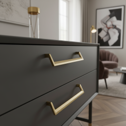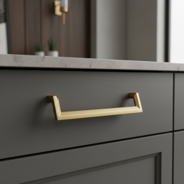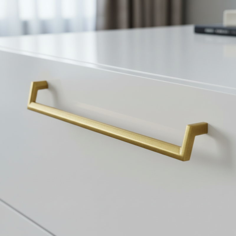 Der Griff AMORA in matter Goldausführung ist ein elegantes, modernes und zeitloses Accessoire, das Möbeln einen Hauch von Luxus verleiht, ohne übertrieben zu wirken. Seine klaren, geometrischen Linien mit charakteristischem Knick wirken designorientiert und harmonisch, wodurch er sich für moderne Küchen, Bäder, Wohnzimmer und Ankleidezimmer eignet.