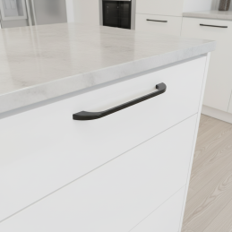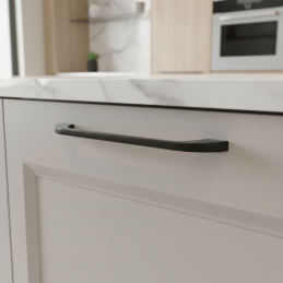 Der Griff DARA in schwarzer matter Ausführung ist eine elegante und minimalistische Lösung für moderne Möbel. Seine sanft gebogene Form und die schlanke Linie wirken leicht, zeitlos und sehr geschmackvoll. Die matte schwarze Farbe verleiht dem Griff ein anspruchsvolles Aussehen und schafft einen markanten Kontrast, der sowohl auf hellen als auch auf dunklen Türen, Holz und lackierten Oberflächen schön zur Geltung kommt.