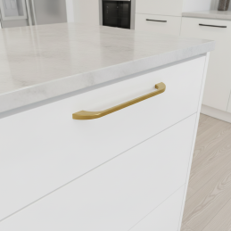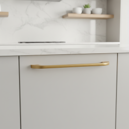 Der Griff DARA in gebürstetem Gold-Finish ist ein elegantes und zeitloses Accessoire, das dem Interieur einen Hauch von Luxus und moderne Raffinesse verleiht. Seine schlanke, sanft gebogene Form wirkt leicht und harmonisch, während die gebürstete Goldoberfläche dem Griff einen dezenten Glanz ohne störende Effekte verleiht.