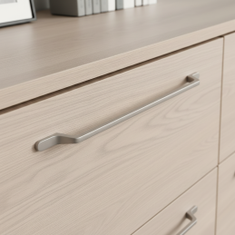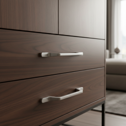 Die Edelstahl-Oberfläche ist besonders beliebt wegen ihrer Widerstandsfähigkeit, einfachen Pflege und der Fähigkeit, sich natürlich mit verschiedenen Materialien zu kombinieren – von Holz über Laminat bis hin zu lackierten und matten Oberflächen. Der Griff ELIDA ist ideal für Küchen, Bäder, Garderoben, Kommoden und Büromöbel.