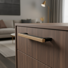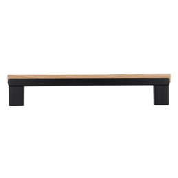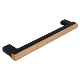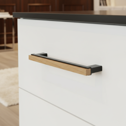 Der moderne Möbelgriff ISABEL vereint den Kontrast von schwarzem Metall und natürlichem Eichenholz mit lackierter Oberfläche. Die elegante Materialkombination schafft ein zeitloses Design, das sowohl zu minimalistischen, skandinavischen als auch modernen Interieurs passt.