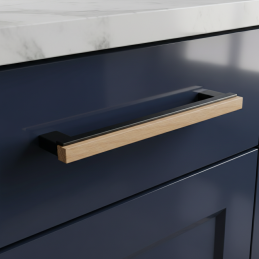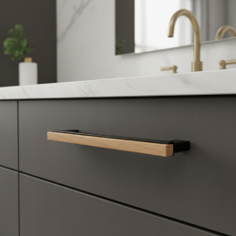 Der Holzteile aus lackierter Eiche bringt Wärme und Natürlichkeit in den Raum, während die schwarzen Metallgriffe Festigkeit und visuelle Stabilität verleihen. Der Griff ist die ideale Wahl für Badmöbel, Kommoden, Schränke oder Küchenzeilen.