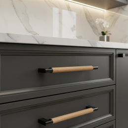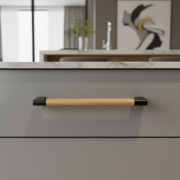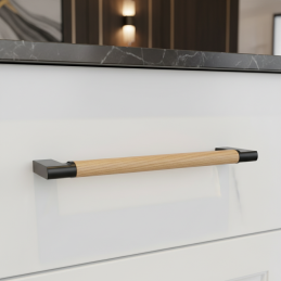 Der moderne Möbelgriff ALICIA verbindet eine zeitlose schwarze Oberfläche mit dem natürlichen Element lackierten Eichenholzes. Die Kombination aus Metallgriff und Holzelement schafft einen harmonischen Kontrast, der in modernen, skandinavischen sowie industriellen Interieurs hervorsticht.
