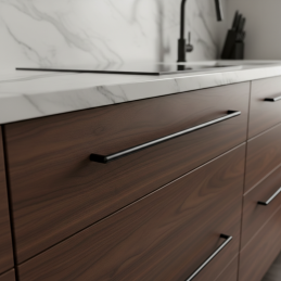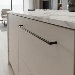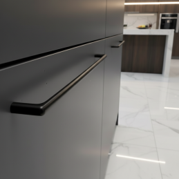 Der elegante Möbelgriff ARENAL in der Ausführung schwarz matt stellt die ideale Lösung für moderne und industrielle Interieurs dar. Die minimalistische Form in Kombination mit der tiefmatten Oberfläche verleiht den Möbeln einen markanten, aber zugleich zeitlosen Charakter.
