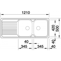 Das Spülbecken ist mit zwei gleichwertigen Becken mit den Maßen 345 × 420 mm und einer Tiefe von 165 mm ausgestattet. Diese Lösung ermöglicht eine komfortable Arbeitsaufteilung in der Küche: