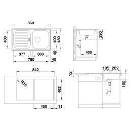 Ausschnitt für Arbeitsplatte: 842 × 462 mm, R15