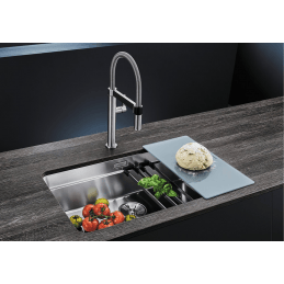 Blanco Etagon 700-U ist ein Premium-Edelstahl-Küchenspüle, die ein geräumiges, kapazitätsstarkes Becken mit dem innovativen ETAGON-System kombiniert. Dieses System ergänzt die Spüle um eine dritte Arbeitsebene mithilfe von universellen Schienen, wodurch die Spüle zu einem vollwertigen Spülzentrum mit deutlich höherer Arbeitseffizienz wird.