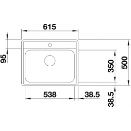 Mit den Maßen 615 × 500 mm bietet es ausreichend Platz für den komfortablen täglichen Gebrauch, wobei das Fehlen einer Abtropffläche das klare und zeitlose Erscheinungsbild der Arbeitsplatte unterstreicht.