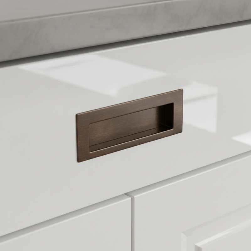 Eleganter minimalistischer Griff, der zum Einfräsen in die Oberfläche von Türen oder Schubladen bestimmt ist. Die Messingoberfläche wirkt warm, luxuriös und zeitlos. Sie ist die ideale Wahl für moderne sowie klassische Innenräume und verleiht den Möbeln einen hochwertigen Designakzent.