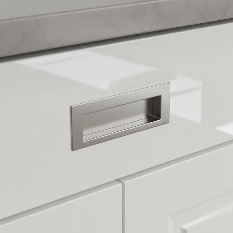 Eleganter minimalistischer Griff, der zum Einfräsen in die Oberfläche von Türen oder Schubladen bestimmt ist. Die Oberfläche in gebürstetem Nickel wirkt modern, sauber und zeitlos. Der sanfte Satin-Glanz verleiht den Möbeln ein anspruchsvolles Aussehen und harmoniert hervorragend mit Holz sowie mit hellen und dunklen Dekoren.