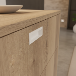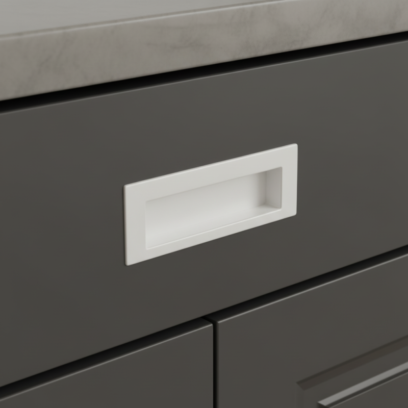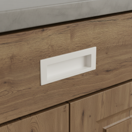 Eleganter minimalistischer Griff, der zum Fräsen in die Fläche von Türen oder Schubladen bestimmt ist. In weiß matter Ausführung wirkt er sauber, harmonisch und modern, ideal für helle Innenräume und skandinavischen Stil.